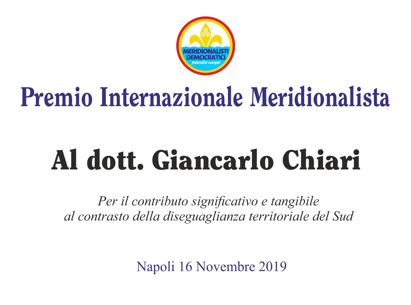 I meridionalisti democratici hanno istituito il Premio Internazionale Meridionalista e consegnato i primi due al dott. Giancarlo Chiari e all’ing Roberto Longo il 16 novembre 2019 a Napoli. I due attivisti meridionalisti sono stati premiati per aver dato un contributo effettivo e verificabile nella lotta contro la disuguaglianza territoriale che danneggia il Mezzogiorno.